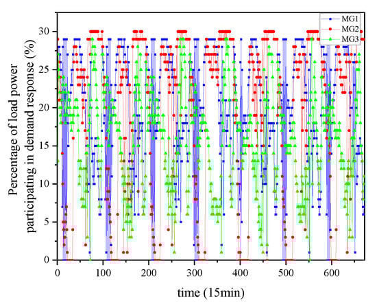 Finally, this paper shows the utilization of energy storage and demand resources by each MG for one week, as shown in Figure 13 and Figure 14, respectively. It can be seen that the energy storage utilization rates of MG1 and MG3 were high. This is because many distributed wind-power resources existed in MG1 and MG3, in which large volatility of wind power output improved the utilization of energy storage system. In addition, demand–response resources were fully utilized in every microgrid, which also reflects the importance of load regulation to economic operation.