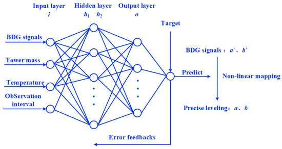 The present work focuses on the development of a predictive tool to accurately estimate foundation settlement of the bridge tower. This tool is based on artificial neural networks (ANNs) and makes use of the precise leveling data. For the bridge tower in the process of construction, the tower mass, GNSS signals, precise leveling data, and observation time are regarded as the input layer by BP neural network to establish the non-linear mapping relationship between the model parameters a’ and b’ obtained through GNSS-based parameter fitting and the parameters a and b obtained through the precise leveling measurement, as shown in Figure 5. For the bridge tower in the operation process, there is generally no need to implement regular precise leveling measurement. As the above consequence, the measured data can be mapped to the revised foundation settlement data according to the GNSS signal and the non-linear mapping relationship obtained through training in the process of construction. Then, the final settlement can be predicted according to the selected settlement model. The flow chart representing the method in this paper is shown in Figure 6.