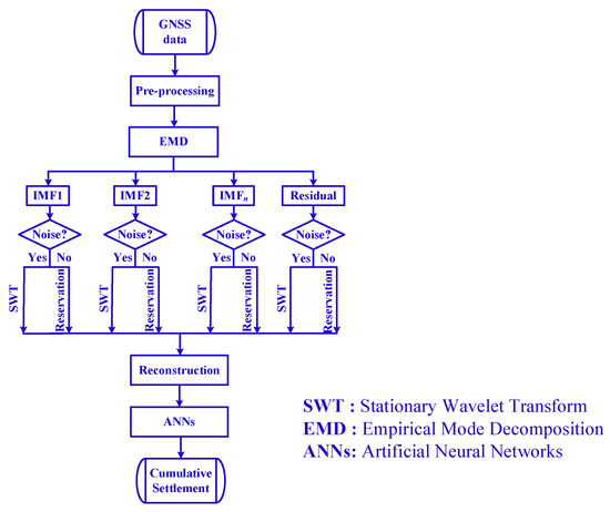 The technological improvement in Global Navigation Satellite System (GNSS) tech-niques and advances in data processing algorithms, compared with the traditional deformation monitoring methods, have provided real-time 3D absolute displacements, continuously operating under all-weather conditions, and no need for line-of-sight between stations. With the increase of sampling frequency and dual-frequency GPS real-time kinematic, GNSS technology has been carried out to examine the ability of displacement detection of static and dynamic response of high-rise buildings [2] and long-span bridges [3]. Due to the satellite ephemeris error, tropospheric delay error, multipath effect error, etc., the obtained data with real-time GNSS techniques has a short-term accuracy of 10 mm. However, at times, foundation displacement monitoring requires greater accuracies during construction and operation. Then, the way of collecting data directly through GNSS cannot meet the accuracy requirements in real-time monitoring of foundation displacement and prediction of the final settlement.