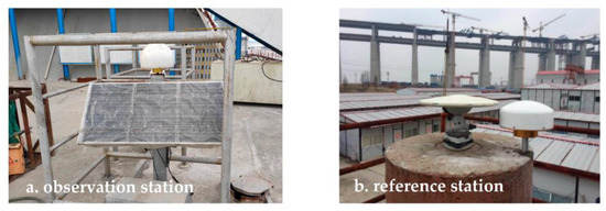In order to verify the accuracy of the proposed method in this paper, GNSS observation stations are established in a highway-railway cable-stayed bridge in the construction stage with a main span of 1092 m, as shown in Figure 7. HWA-BM-300 dual-frequency receiver is arranged at each corner of the cushion cap to receive signals of GPS and BDS satellites at the same time. Whereas, the data serving analysis is mainly from GPS + BDS signals, which can monitor the deformation of the cushion cap. The reference station is set up in the south bank (within 2 km), in which the GNSS base station used for measuring and lofting has been built. The reference station antenna is set up side by side with the original antenna on the top of the steel pipe pile of the base station (without mutual interference), and the wireless transmission and solar power supply are adopted, as shown in Figure 8. In addition, a base station for monitoring the deformation of bearing platform is set up independently.