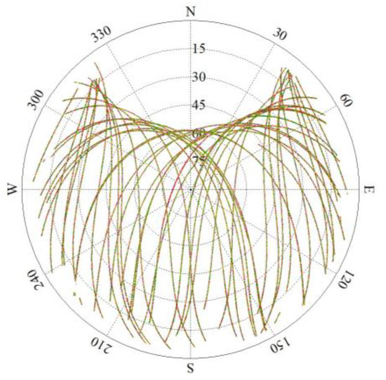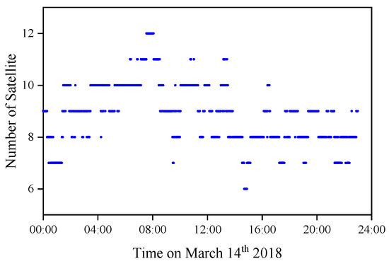 Figure 9 and Figure 10 show the satellite visibility of the GNNS at the observation station and reference station on 14 March 2018. As shown, GNSS receivers can obtain signal from more than four satellites, meeting the needs of three-dimensional positioning. Since all the monitoring stations are not far from this site, they can have a similar observation condition.