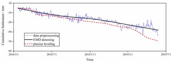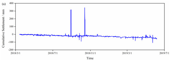 The data of this study are analyzed by using the proposed method from 14 March 2018 to 27 June 2019. These times are respectively corresponding to the concrete pouring of the 6th tower section and the concrete pouring of the 54th tower section, with a total of 63 manual measurements by precise leveling during this time. The GNSS high-precision device sends data once every 5 s, and the software carrying out resolving the data once every 4 h by the proposed method in this paper. Since the foundation settlement is a slow process, and considering the discreteness of the original data, the bad values can be eliminated according to the median absolute difference of three times, and the data loss induced by signal masking can be compensated by linear interpolation, to obtain the pre-processed signal. Figure 11a,b represents the original settlement data and pre-processed signal of observation station A, respectively. As shown in the figure, the pre-processing data eliminate the bad points and missing points in the original signal.