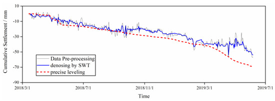 Figure 12 shows the comparison between the GNSS signal denoised by sym2 wavelet basis function and the results of manual measurement by precise leveling. It can be seen that after the SWT noise reduction, the difference sequence of multipath model extracted from GNSS settlement accumulation curve is basically on the zero level, which indicates that such a method can play a more effective role in extracting the systematic (repetitive) section of multipath errors.