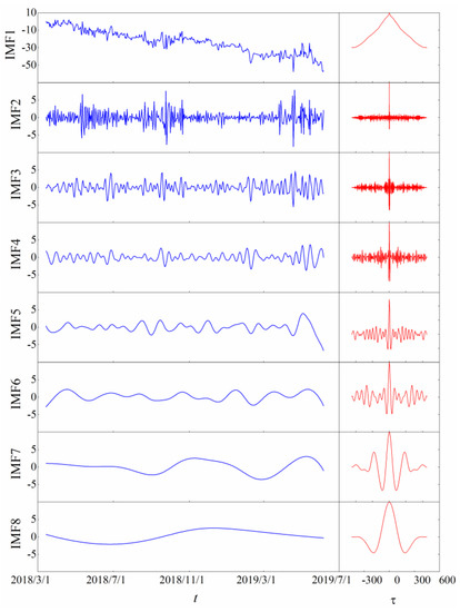 The GNSS signal after the multipath error eliminated through wavelet de-nosing is decomposed by EMD, and the autocorrelation function is calculated. Generally speaking, that the signal power is concentrated in low-frequency ranges, and the noise is concentrated in high-frequency ranges. Figure 13 shows the intrinsic mode functions and its autocorrelation functions obtained through EMD decomposition. As shown in the autocorrelation functions, the intrinsic mode functions from the first order to the seventh order are all dominant noise, which can be regarded as the noise signal, while the eighth order is the measured signal, which is required to be maintained. Figure 14 shows the GNSS signal denoised by SWT and EMD. Compared with the GNSS signal treated only by wavelet de-nosing, the EMD method greatly reduces the noise power of the GNSS signal and has the same trend with the elevation of the measuring point obtained by precise leveling.