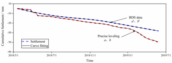 GNSS signal denoised by EMD can meet the requirements of general engineering projects, while in terms of controlling projects such as the long-span bridge, the denoised data are treated with error correction to meet the requirements associated with real-time observation and final prediction of foundation settlement. In this paper, the hyperbolic model is applied to fitting the parameters of GNSS signal and the settlement data obtained by precise leveling, respectively. The fitting parameters of the two groups of data are obtained, which are expressed as a, b and a’, b’, respectively. The fitting figure is shown in Figure 15.