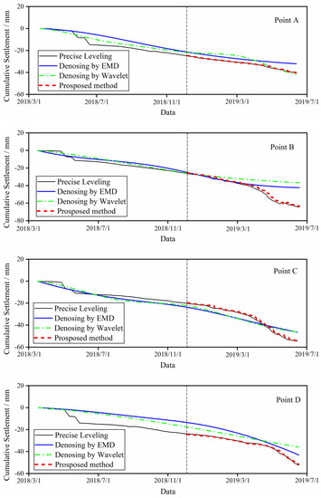 Figure 16 and Table 3 present the comparison of the real-time data of foundation settlement at the four observation stations of the bearing platform by the proposed algorithm, empirical mode decomposition, and wavelet decomposition. As shown in the figure, the black solid line indicates the results of precision leveling; the dotted green line shows the results processed with empirical mode decomposition and the solid blue line for the results of wavelet decomposition. The dotted red line represents the real-time subsidence data at the points processed by the proposed method: the multipath errors and random noise of the data were erased by stationary wavelet transform and empirical mode decomposition, and the data were rectified. It should be noted that, the signal-to-noise ratios and mean-square errors in the table represent the result errors between the three methods and precise leveling. According to data, the errors between the GNSS signals corrected by the proposed method with the precise leveling were all less than 1 mm, which proves that the proposed method in the paper can better rectify GNSS signal errors, and hence have higher accuracy.