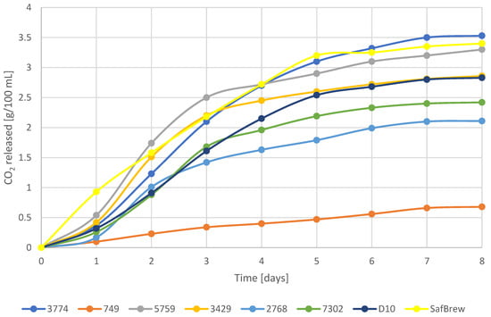 Fermentation is the process when sugars available in the wort are converted by yeast into alcohol, carbon dioxide and heat [18]. The S. cerevisiae yeast strain is known especially for excellent fermentation properties, i.e., fast fermentation rate and high ethanol production [19]. In the present study, the S. cerevisiae strain was characterized by the shortest period of adaptation to the new environment and the highest rate of fermentation for the first 2 days of the process (Figure 1). In the case of non-Saccharomyces strains (W. anomalus and D. bruxellensis), the adaptation time was longer, and the highest amount of produced CO2 was observed between the 2nd and 4th day of the process. These strains, apart from S. cerevisiae, fermented at a similar level from day 2 to the end of the process. This is also confirmed by the ethanol content results presented in Table 1. The ethanol content obtained by individual strains (S. cerevisiae, W. anomalus, and D. bruxellensis) did not differ statistically. The yeast W. anomalus shows a good ability to utilize maltose under both aerobic and anaerobic conditions [20]. Lee et al. [21] have proven that some wild strains of W. anomalus are able to make better use of maltose during the fermentation process than other commercial brewing yeast. This is also confirmed by the results presented in the article where this strain used over 90% of the maltose available in the wort for fermentation (Table 1). On the other hand, the D. bruxellensis strain is capable of producing acetic acid in the presence of oxygen. This feature is particularly desirable in the production of lambic beers, where it is increasingly used [22]. This was also confirmed in the presented article (Table 1), where D. bruxellensis produced the highest amount of acetic acid among all the analyzed strains. The best fermentation properties, and thus the use of the largest amount of maltose and the production of the largest amount of ethanol, were observed in the case of the S. kudriavzevii strain (Figure 1, Table 1). This strain produced the largest amount of CO2 between the 6th and 8th day of the fermentation process. S. kudriavzevii is present in Belgian beers of spontaneous fermentation and is characterized by the rapid absorption of carbohydrates, high ethanol tolerance and the ability to ferment in the absence of oxygen [23]. Strains H. uvarum and S. paradoxus released an average of 2.4 g CO2/100 mL during the fermentation process. H. uvarum yeast is characterized by very low fermentation power and efficiency, but it contributes to improving the complexity of the aroma of fermented beverages, such as beer or wine [23]. In the present study, this strain was characterized by a lower amount of carbon dioxide released during fermentation. However, it used approximately 98% of the available maltose and thus produced an ethanol content of 4.31 g/L. The lowest fermentation ability of the brewing wort was observed in the case of Z. bailii strain. Time of adaptation to the new environment for this strain lasted the longest, and after 8 days of fermentation, they produced approximately 80% less CO2 than the S. cerevisiae and S. kudriavzevii strains. This strain was characterized by a low maltose fermentation capacity. During the entire process, Z. bailii strain used only 2% of the available maltose, producing a beer with a content of 1.73 g/L of ethanol. Taking into account the current interest in the production of low-alcohol beers due to the constantly developing market and lower tax burdens [24], the analyzed Z. bailii yeast strain shows potential for the production of low-alcohol beers.