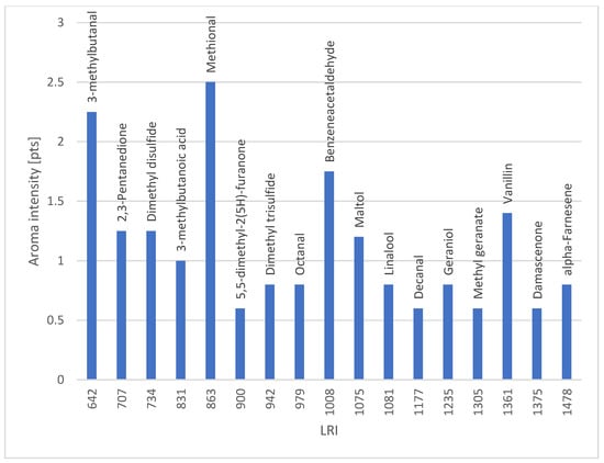 We observed differences between the results of olfactometric and sensory analysis, which may be related to the creation of new aromas by overlapping aroma notes. Aroma compounds with similar attributes often have additive interactions that lower the thresholds of the individual compounds. Moreover, in certain cases, aroma compounds exert stronger than anticipated effects by interacting synergistically or antagonistically (masking effect) [56].