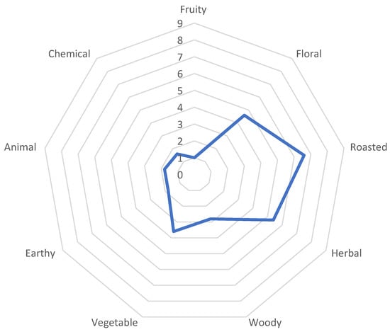 The sensory analysis of the aroma by QDA method confirmed the GC-O results (Figure 3). The highest scores (6.6 pts) on a 9-point scale were obtained by roasted notes, followed by herbal (5.4) and floral notes (4.6). Vegetable notes associated with the presence above the detection threshold of sulfur components, such as methional, dimethyl disulfide and dimethyl trisulfide, scored lower. At the same time, they did not have a negative impact on the overall assessment of the aroma of the hopped wort.