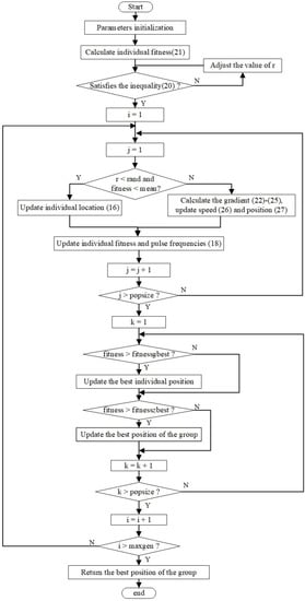 The combination of the two could improve the search efficiency. The global update formula is shown in Formulas (26)–(28), where grad represents the gradient and is a learning factor. The specific description of the G-BAPSO algorithm is shown in Algorithm 1, and the flow chart is presented in Figure 2.