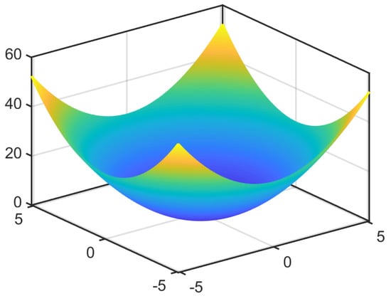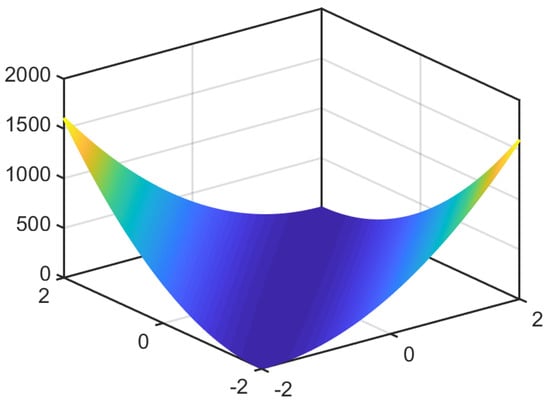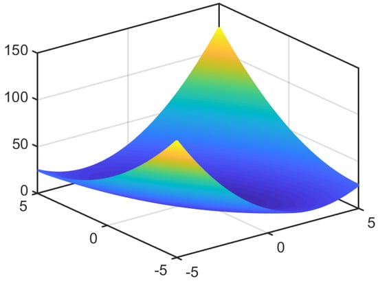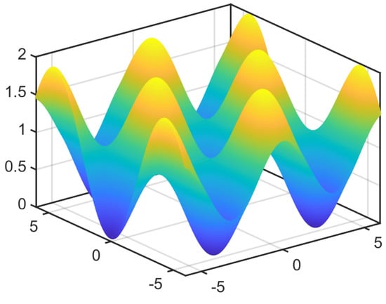 Continuous functions are selected as the benchmark functions in this section because the objective function proposed in Section 2 is multivariate continuous functions. is multi-peak function and the rest are concave function. The graphs of the four functions are shown in Figure 3, Figure 4, Figure 5 and Figure 6. Figure 3 and Figure 6 show the graphs of binary functions corresponding to and , respectively.