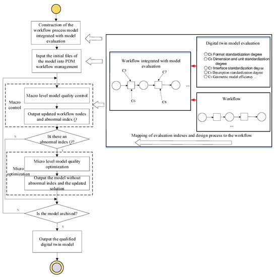 Based on the current state of digital twin model quality studies and digital twin model construction, this study proposes a workflow management-based digital twin model quality optimization and control method to effectively apply a wide variety of digital twin model evaluation methods and optimization solutions. The proposed method integrates the digital twin modeling process into the workflow of product data management (PDM) [18,19] so that the flow of the model in the workflow can be controlled at the macro level through workflow techniques in the design process, and the model quality optimization can be supported at the micro level. The operation framework is shown in Figure 1. The main steps of the proposed method are as follows: First, the initial files of the model are inputted into the PDM’s workflow integrated with digital twin model evaluation. Then, through macro-level model quality control, and based on workflow management, the qualified digital twin model continues its flow, leaving the unqualified digital twin models at the current workflow node. If an abnormal index is found in the macro control, the model quality is optimized through micro-level model quality optimization methods by selecting the solution for the abnormal index. Finally, the above process is repeated until the model is archived in the workflow, at which moment the digital twin model of acceptable quality is outputted.