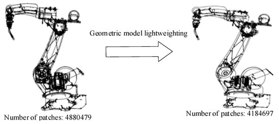 The digital twin model of a robotic arm processed by the geometric model lightweighting solution in [15] is shown in Figure 2, and the C9 calculation is expressed in Equation (2). Then, the geometric model efficiency is 0.858. In Equation (2), n9 is the total number of geometric models, ngmpi is the total number of parameters of the ith geometric model before lightweighting, and is the number of parameters of the ith geometric model after lightweighting.