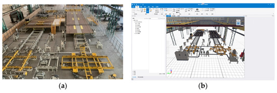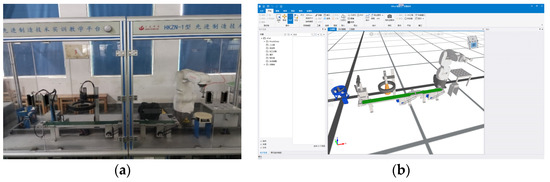 Practical teaching platform: (a) physical entities; (b) digital twin models.