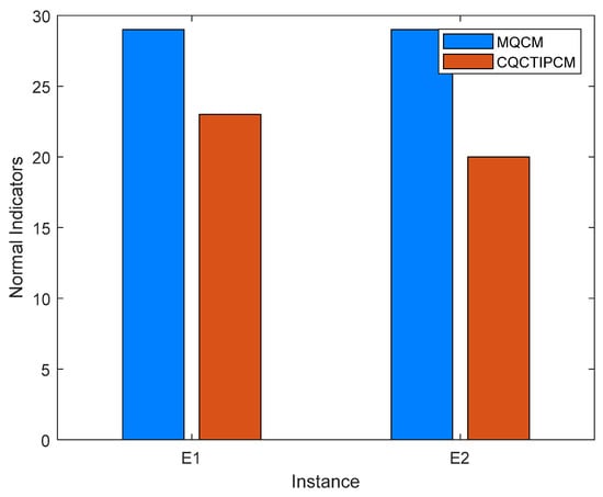 To verify the advantages of macro control, models E1 and E2 underwent the flow from node N0 to node N1. As a result, model E1 successfully flowed to the next workflow node N1, while model E2 with abnormal quality indexes was left at its original workflow node N0. The abnormal quality index for model E2 in this execution stage is C9, where the current C9 of models E1 and E2 is shown in Figure 10. It can be seen that the C9 value of model E1 achieves the target threshold. If the threshold values of other required evaluation indexes are satisfied, the workflow can proceed to the next node N1 according to the constraint rules. Due to the low C9 value in model E2, the target threshold is not achieved, and the model does not meet the requirement of flowing to the next node, remaining at the original workflow node N0. Then, models E1 and E2 underwent the entire workflow to the end, and the methods (MQCM) in this paper were compared with the critical quality characteristic immune preventive control method (CQCTIPCM) [23] without considering macro quality control. CQCTIPCM is not implemented from the beginning of geometric modeling, and concentrated quality evaluation and optimization for the previous stages are performed before model fusion. Figure 11 shows the abnormal indexes of each model before and after quality control. It can be observed that the method proposed in this paper can keep models with abnormal indexes in the workflow through macro-level model quality control, thus avoiding the output of models with abnormal indexes.