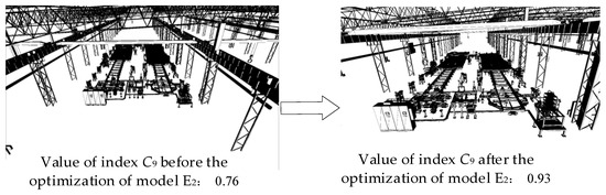 To verify the advantages of combining macro and micro control, the flow of model E2 from workflow node N2 to N3 was used as an example for analysis. Based on the macro-level control results, micro-level quality optimization was further applied to the model with abnormal indexes, and the results are presented in Table 3. The E2 abnormal indexes in Table 3 are those generated when applying macro quality control methods, while the E′2 abnormal indexes are those generated without the quality optimization of model E2. According to Table 3, the C9 and C16 abnormal indexes interact with each other, and the results of the earlier design activities affect the subsequent modeling quality. Through micro control, targeted geometric model optimization solutions are selected to optimize abnormal index C9. According to the evaluation by Equation (2), the scores before and after optimization are 0.76 and 0.93, respectively, as shown in Figure 12. Due to the absence of a direct solution for abnormal index C15 in the solution library, the new solution for it is stored in the solution library to solve similar problems in the future. The experiments showed that by spreading the model evaluation tasks across the transitions of the workflow and avoiding addressing too many abnormal indexes in concentrated evaluation and optimization, we effectively prevented early abnormal activities from affecting subsequent design activities while providing targeted solutions to abnormal indexes.