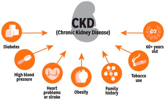 The kidney is a very important organ in the human body. Excretion and osmoregulation are two of the most important functions of this organ. In layman’s terms, the kidney and excretion systems gather and dispose of all poisonous and useless material from the body. In India, 1 million instances of CKD are diagnosed each year. The patient can live for a long period with poor kidney functions if the condition is detected early on and the appropriate treatments are started [1,2]. However, it is common that the patient’s condition deteriorates over time and the number of nephrons falls rapidly. As a result, increased hazardous materials in the blood endanger the patient’s life. The final stage is referred to as “terminal kidney failure.” To keep the patient alive at this stage, one of hemodialysis, continuous peritoneal dialysis, or kidney transplantation procedures should be used. CKD, which eventually leads to renal failure, can cause a variety of issues in society, including economic, social, and medical issues. The high cost of hemodialysis might be used as an illustration of economic issues. Patients experience emotional and social problems as a result of their continued use of medicines and the consequences thereof. Furthermore, the medications utilized can interact with various organs and systems, resulting in a considerable reduction in life expectancy [3].