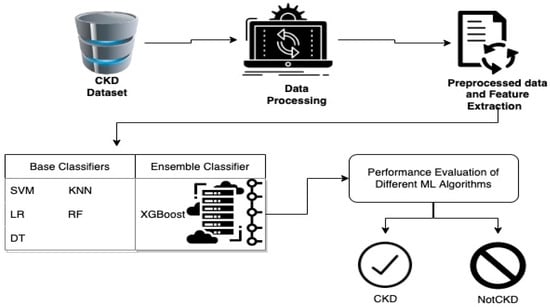 To analyze the CKD dataset, a sequence of experiments has been conducted utilizing ML methods such as SVM, KNN, DT, RF, LR, and XGBoost classifier. Figure 2 depicts the general pattern of CKD classification.