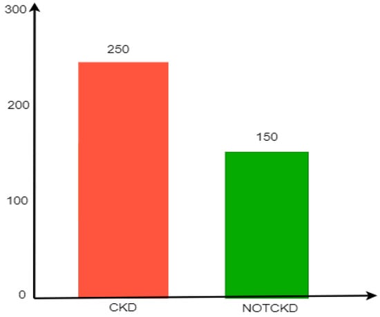 The dataset of CKD has been taken from the Irvine ML Repository [6], which included 400 patients. Besides the class characteristics, namely “ckd” and “notckd,” the dataset has twenty-four features separated into eleven numeric features as well as thirteen category features. Age, specific gravity, blood pressure, albumin, red blood cells, sugar, pus cells, red blood cells, pus cell clumps, bacteria, blood glucose random, blood urea, serum creatinine, sodium, potassium, hemoglobin, packed cell volume, white blood cell count, red blood cell count, hypertension, diabetes mellitus, coronary artery disease, appetite, pedal edoema, and anaemia are some of the characteristics. Ckd and notckd are the two diagnostic classes. Figure 3 depicts count of diagnosis of kidney disease in the dataset.
