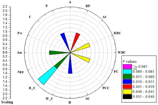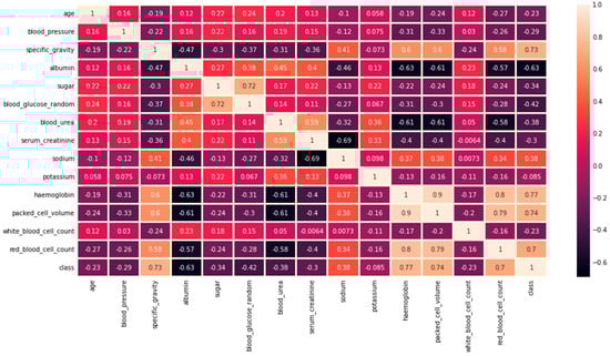 We observe that several of the features we developed have a stronger linear link with one another. The Pearson correlation coefficient between these two features is close to one, which supports the heat map’s message. Two features that are completely correlated with one another can be expressed by one another, which means that the information these two features carry is identical. The accuracy of the model can be increased while causing less data information loss for the two features with a high linear association by deleting one of them. Figure 4 shows that the absolute values of the heat map of attribute correlations to the class label demonstrate that age, specific gravity, and blood pressures have the highest correlations (more than 0.5). The secondary characteristics of sugar and albumin, for example, have correlations greater than 0.2.