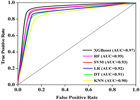 Figure 6 displays Area under the (ROC) Curve. The LR, SVM, DT, RF, KNN, and XGBoost models are represented by lines of a different color in the figure. The black curve’s AUC value of XGBoost is somewhat higher than that of the other four curves, indicating that it has the best performance out of the five models.