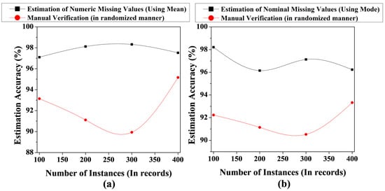Initially, the few vital steps taken in the preprocessing stages are evaluated. The essential process is to assess the estimation accuracy of mean and mode methods in identifying the missing values over 400 considered instances. Thus, Figure 7a,b depicts the resultants of the process in comparison with the randomized manual verifications.