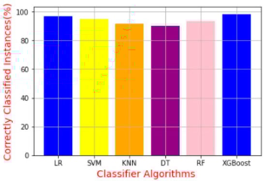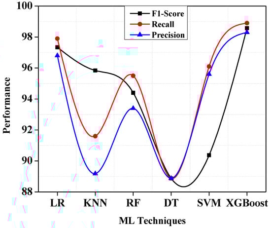 The F1-score of the SVM, LR, DT, KNN, RF, and XGBoost classifiers is 96.73%, 96.93%, 93.01%, 94.75%, 94.73%, and 98.9%, respectively. The performance evaluation of these ML algorithms is shown in Figure 9.