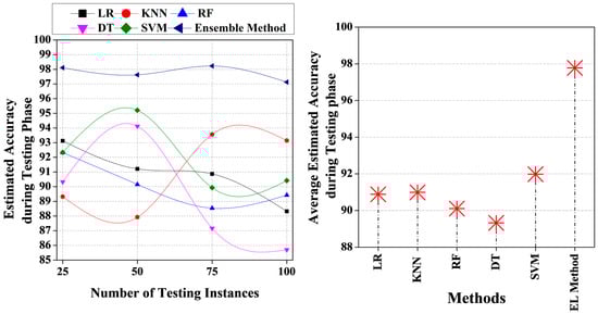Figure 10 exposes the superior performance of the proposed EL method during the testing phase in the classification of CKD. Such test validation is required to monitor the development of the trained algorithm and fine-tune or maximize its performance. Therefore, the learnt logic of the EL technique is regularly evaluated on a sample size of about 100 instances, and the findings (average accuracy is 97.78%) acquired provide concise evidence that the system maintains ideal consistency and precision.