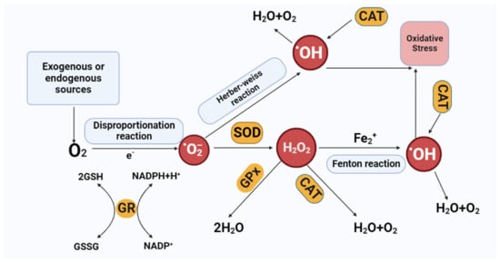 On the other hand, an antioxidant is a compound that reduces or scavenges reactive species or blocks the oxidation in cells []. In other words, antioxidants have the power to stop or delay the oxidation reaction to regulate the excessive production of oxidants []. Thiols and polyphenols are common examples of antioxidants for their reducing behavior []. Plants and animals consist of two types of antioxidants: non-enzymatic (vitamin E, C, carotenoids, lipoic acid, and others) and enzymatic (catalase (CAT), superoxide dismutase (SOD), glutathione peroxidase (GPx), Glutathione-S-Transferase (GST), Glutathione reductase (GR), etc.). These enzymatic antioxidants have important functions in regulating cell homeostasis []. In a nutshell, the antioxidant mechanisms are (a) inhibiting the production of reactive species, (b) scavenging oxidants, (c) restoring the damaged molecule, (d) blocking the formation of harmful secondary metabolites and inflammation mediators, and (e) developing and boosting the natural antioxidant defense system. These defensive mechanisms work together to prevent oxidative stress in the body []. However, in redox biology, superoxide dismutase quickly turns into H2O2 and O2 via the SOD enzyme. The Fenton reaction can decrease metal ions to produce OH. from H2O2, which is issued in systemic inflammation [,]. OH. are reactive and so damages macromolecules. Antioxidant enzymes (catalase, glutathione peroxidase) can detoxify H2O2 to avoid the production of OH. (Figure 2).