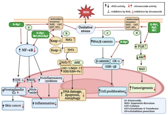 The overproduction of ROS causes oxidative damage which dysregulates several signaling pathways. (a) Oxidative stress increases NF-κB, thus increasing the expression of COX-2, iNOS, and pro-inflammatory cytokines that may cause skin cancer and inflammation. However, ginsenosides Rg1, Rg3, Rb1, and Rh3 increase the antioxidant enzymes (SOD, CAT, GST, and GPx) activity, which suppresses the activation of NF-κB and oxidative stress totrigger skin cancer and inflammation. (b) In extreme antioxidant stress conditions, Nrf2 dissociates from keap1 and binds with the ARE which down-regulates the antioxidant enzyme production, resulting in DNA damage, apoptosis, autophagy, etc., whereas, Rg3, Rb1, and Rh3 increase the antioxidant enzymes by activating the Nrf2 that suppresses the disease conditions. (c) During oxidative stress, β-catenin is not decomposed, leading to the activation of the Wnt/β-catenin pathway. Ginsenoside Rg1 inhibits Wnt activation and increases the activation of β catenin, glycogen synthase kinase-3 (gsk-3), and casein kinase-1 (CK-1) proteins that reduce cell proliferation; (d) similarly, ginsenosides Rg3, Rb1, and Rk1 increase antioxidant enzyme activity and PI3K/Akt to decrease oxidative stress and tumorigenesis. Abbreviations: (ROS-reactive oxygen species, MMP = matrix metalloproteinases, NF-κB-nuclear factor-kappa B, COX-2-cyclooxygenase-2, iNOS-inducible nitric oxide synthase, Keap-1-Kelch-like epoxy chloropropane-related protein-1, Nrf-2-nuclear factor erythroid 2-related factor 2, ARE-antioxidant response element, HO-1-Heme oxygenase-1, NQO-1-NAD(P)H: quinone oxidoreductase 1, SOD-superoxide dismutase, GSH-Px = GSH and glutathione peroxidase, CK-1-casein kinase-1, gsk-3-glycogen synthase kinase-3, PI3k-Phosphatidylinositol-3-kinase, and Akt-protein kinase B).