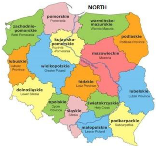 Location of provinces in Poland [62]. Scale: 1:1,000,000.