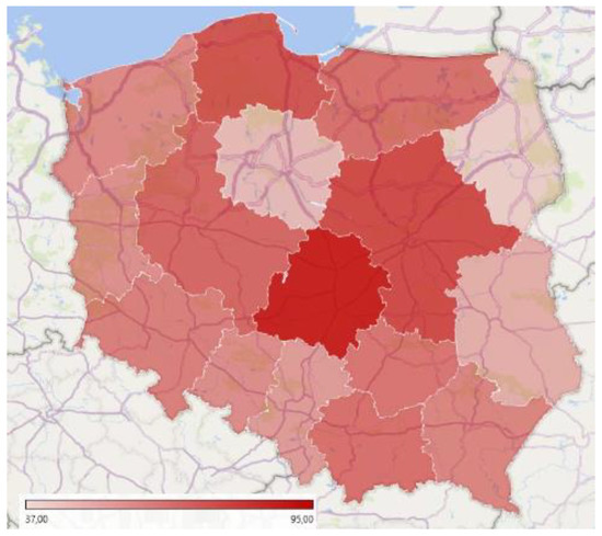 More than 38 million people live in Poland (Figure 1). It occupies an area of 312,705 km2 and is divided into 16 provinces (Table 1, Figure 2). In the states studied, the average reduction in traffic accidents between 2001 and 2021 was more than 56%. Strongest in Kuyavsko–Pomorskie (70%) and Podraskiye (69%), lowest in Rubskiye (32%). The number of automobile accidents depends on the number of residents living in a particular state [59,60]. The number of accidents in Poland is still very high compared to the rest of the European Union [61]. Therefore, every effort should be made to reduce this value and identify the states with the most traffic accidents (Figure 3, Figure 4 and Figure 5). Based on Figure 1 and Figure 3, it can be concluded that the highest number of traffic accidents is in the Mazowieckie Province and the highest number of accidents per 10,000 inhabitants is in the Lodz Province.