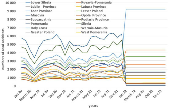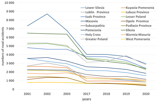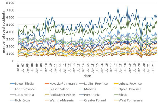 Considering Figure 3 and Figure 4, it can be seen that the number of accidents is decreasing, and accidents are seasonal. The highest number of accidents occurs in the summer months and the lowest in the winter months. In addition, we can see that the beginning of the COVID-19 pandemic, 2020, disrupted the number of traffic accidents, when there was a huge decrease. Between 2001 and 2021, the largest decrease in the number of traffic accidents, more than 300%, is seen in the following provinces: kujawsko–pomorskie, lubelskie, podlaskie. On the other hand, the smallest decrease, during the analyzed period, was seen in Lubuskie province and amounted to less than 50%.