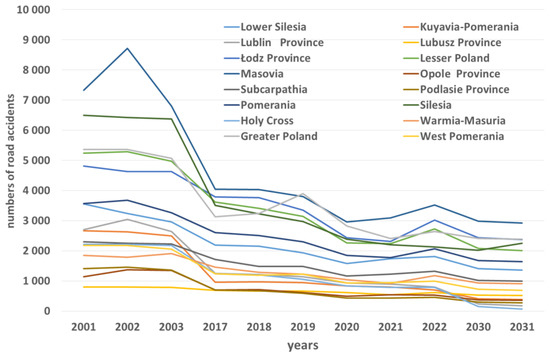 Many people die on the streets every year. The value is declining year by year, but there are still plenty of them. Although the COVID-19 pandemic reduced the number of traffic accidents, it is still very high. For this reason, in order to do everything possible to minimize the number of road accidents, it is important to know the federal states with the most road accidents and what the accident forecast is for the next few years. The purpose of this article is to predict the number of road accidents by state in Poland. The survey was divided into two parts. The first is an analysis of the annual data of police statistics on the number of road accidents in Poland for the period 2000–2021, upon the prediction of the number of traffic accidents from 2022 to 2031 was decided. The second part of the study looked at monthly data from 2000 to 2021. Again, the forecasts analyzed were determined for the period from January 2022 to December 2023. The results of this study indicate that a decrease in the number of accidents is also expected in the coming years, which becomes especially clear when analyzing the annual data. It is worth noting that the prevailing COVID-19 pandemic has distorted the results obtained. The study was performed in MS Excel using the selected propensity model.