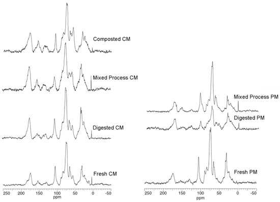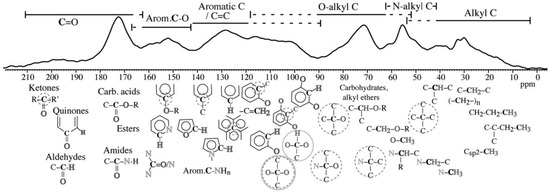 Similarly, HSs extracted from composts obtained from artichoke, pepper or coffee wastes showed significantly different 13C CP-MAS NMR spectra, particularly regarding the alkyl C and O-alkyl C spectral regions [86]. Additionally, the data by Fuentes et al. [87] on HSs extracted from composts of different origin (animal manure, olive mill and winery wastes, domestic wastes) showed significant differences among the spectral intensities of the different regions.