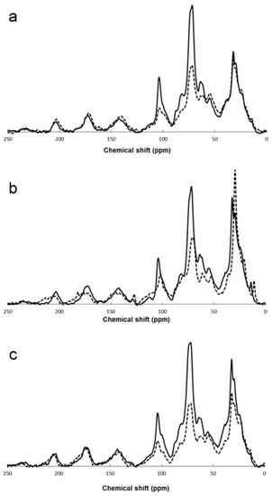 13C CP-MAS NMR spectra of composts (dashed line) and corresponding feedstocks (solid line). Feedstock compositions are: (a) exhausted grape marc and cattle manure 76:24 (w:w); (b) grape marc and cattle manure 72:28 (w:w); (c) exhausted grape marc and poultry manure 67:33 (w:w). Reproduced with permission from Ref. [69].