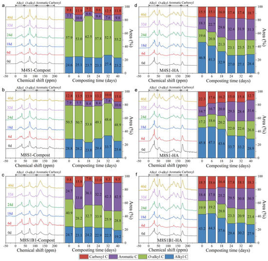 The effect of biochar on compost HAs was also investigated. Biochar has been demonstrated to have positive effects on compost, for example improving compost porosity [89] and favoring carbon and nitrogen retention [90,91]. Liu et al. [62] studied the effect of adding biochar to swine manure and rice straw on the composition of HAs, as well as on compost, as previously mentioned. A comparison of 13C CP-MAS NMR spectra and carbon species distribution of compost and HA samples during composting is shown in Figure 3. Three mixtures of manure, straw as bulking agent, and biochar in different proportions, i.e., 4:1:0, 8:1:0 and 8:1:1 by wet weight, were investigated. In Table 3 the data relative to the different NMR spectral regions for HAs obtained for the three different samples before and after composting are reported. The authors observed a positive effect of biochar on HA formation on the basis of the higher overall spectral intensity. In all cases, the alkyl C contribution sensibly decreased after 40 days of composting, while the aromatic and O-alkyl C contents increased. This was taken as an indication of the decomposition of macromolecules, such as lignin, hemicellulose and cellulose, contributing to the formation of HAs [92]. The amount of carboxyl C in the HA sample with the biochar added was higher with respect to the other samples before composting and also remained high after composting, with a value similar to that of the sample with a higher amount of bulking agent. A high proportion of both aromatic and carboxyl groups in compost HAs, as observed in the presence of biochar and with a higher amount of bulking agent, has been suggested to have positive agronomic effects [93].