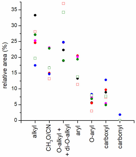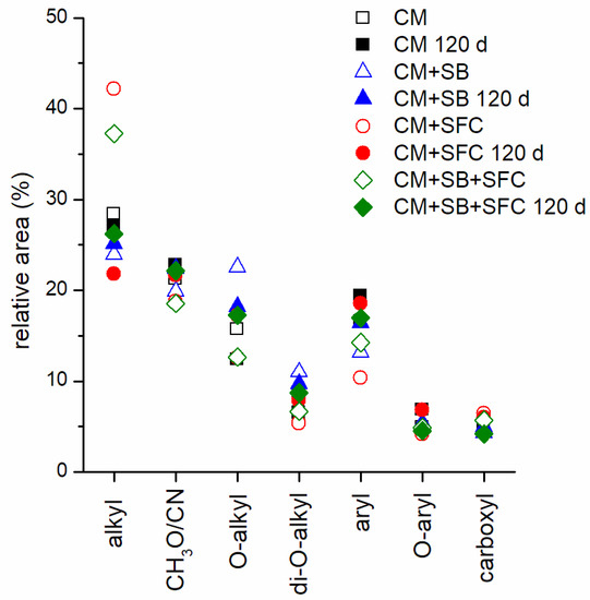 Contrary to the expected trend, the study by Liu et al. [62] on the composting of swine manure with straw and biochar, discussed above, showed in all HA samples a significant decrease in the contribution of alkyl C, and an increase in the contribution of all the other carbon types (except for the carboxyl signal in the pig manure/straw with an 8:1 ratio), the major increase involving the aromatic region. As already stated, this trend was explained by assuming the formation of new aromatic structures contributing to HAs resulting from the decomposition of other macromolecular components.