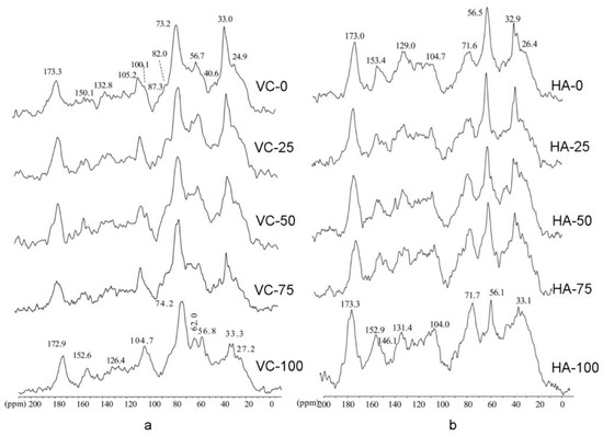 Even the use of additives was found to influence HA composition after composting. Zheng et al. [88] studied compost obtained from pig manure and sawdust with the addition of different amounts of sepiolite, a clay mineral, which is indeed expected to affect the composting process due to its high absorption capacity and cation exchange ability, possibly favoring the humification process. The 13C CP-MAS NMR spectra of HAs extracted from compost obtained from samples with increasing amounts of sepiolite confirmed the increasing extent of humification, as highlighted by the higher relative amount of aromatic C and concomitant reduction in the contribution of alkyl and O-alkyl C. Sepiolite also induced the formation of carbonyl and carboxyl groups. The authors suggested that the reduction in bioavailability of toxic metals, such as Cu and Zn, abundant in pig manure, in sepiolite-amended compost might be related to the higher amount of phenolic and oxygen-containing functional groups of the resulting HAs.