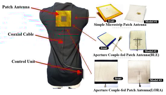 To this end, as shown in Figure 1, simple patch antennas have been developed and presented in this paper to show progressive advancements in the field of flexible, on-body compatible antennas using ordinary fabric textiles. An in-house, silver-ink screen-printed polyester base conductive fabric has been developed with high conductivity, high stretching, and bending resistance with the screen-printing technique [4]. The antennas (shown as model #1, #2 and #3) were developed at 2.44 GHz and 868 MHz, which are widely used frequency bands for long-range communication. Bluetooth low energy (BLE) operating at 2.4 to 2.48 GHz and long-range wireless access networks (LoRaWAN) operating at 863 to 870 MHz are some of the popular communication standards used in long-range track and detection, Internet of Things (IoT) communication devices, etc.