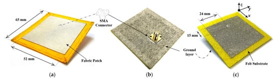The base fabric from the screen printing (polyethylene terephthalate (PET)), is now a conductive fabric sheet measuring 0.12 mm in thickness. This was used for the radiator and ground layer of the patch antenna in Figure 2a. The probe-fed patch antenna is designed with specifications from [17]. The square-shaped radiating patch measures 52 mm on either side. The same material is used for the ground layer which is attached to a 66 mm2 felt substrate. A 10-micrometer adhesive film bonds the 0.12 mm polyester patch and ground with the 1.0 mm thick substrate. To eliminate and/or minimize geometrical errors, a specialized cutting tool was obtained from Cricut Inc. (Maker 3®) for cutting all fabric materials and adhesive tapes.