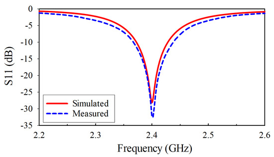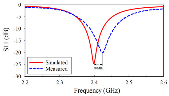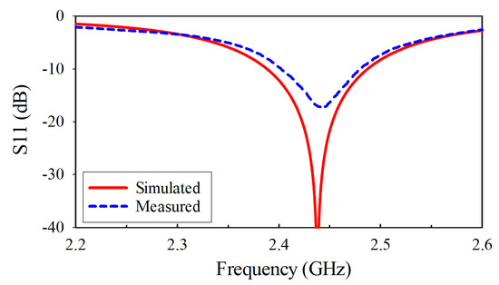 Figure 4 shows the reflection coefficient of the direct printed method with a visible shift in the simulated bandwidth compared to the measured. Simulated S11 at −10 dB is observed from 2.38 to 2.42 GHz (40 MHz bandwidth) and for measured S11 from 2.39 to 2.46 GHz (70 MHz). In addition to incorrect bulk conductivity approximations, the difference could be attributed to fabrication errors with the epoxy application, SMA pin misalignment, and poor curing of epoxy resin.