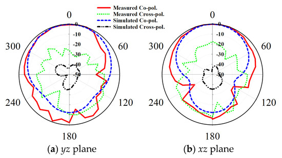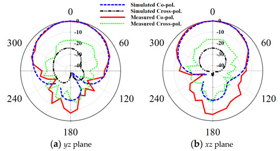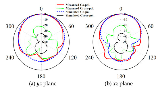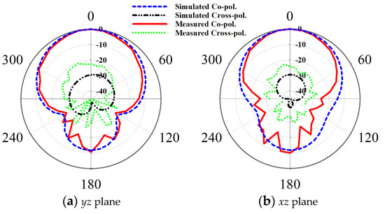 Another area of concern was the cross-polarization (x-pol.) values obtained in the measured results of the BLE model. The measured x-pol. values towards the back-end of the model were rather high as seen in Figure 11a,b. A −5.1 dB x-pol. value in the xz plane and −7.7 dB in yz. Similar to the back radiation, this could be attributed to the smaller ground size which resulted in spurious fringing currents not being properly grounded. The occurrence is not observed in the LoRa model with a 150 × 145 ground size, achieving x-pol. values better than −13.9 dB and −17.7 dB in the xz and yz planes, respectively.