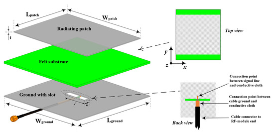 The stable impedance at the feeding section is maintained on the aperture by carefully placing the dielectric section of the cable on the aperture slot with equal widths. The signal wire mesh is fixed to the upper section of the ground (above the slot) while the cable ground mesh is fixed on the lower section as shown in Figure 7. The exposed cables are fixed to the conductive fabric using conductive epoxy with a high curing/adhesion property. After 24 hours of curing, the backside is shielded with a low loss of 0.1 mm polytetrafluoroethylene (PTFE) silicone adhesive tape [23]. The resulting antenna is shown in Figure 8a,b, revealing the cable placement with cured epoxy. The assembly of the radiating patch and ground follows the same procedure used in Section III-A.