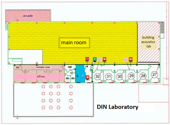The room chosen for the measurements, a laboratory of approximately 650 square metres (see the yellow area of the plan in Figure 1) used as a technical physics laboratory, certainly does not have the acoustic quality of a theatre. However, for the purposes of the analysis, the acoustic quality of the room was not relevant.