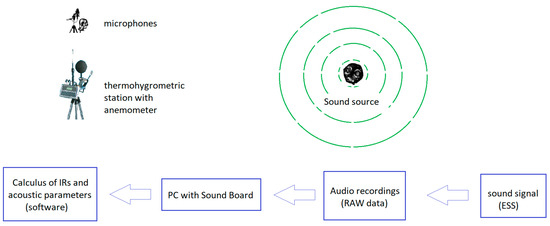 The computer that creates an exponential sweep signal with a frequency range of 40 Hz to 20 kHz and records input signals from the microphones is the main technological component of the measuring system. The outputs were recorded using a Motu Traveler MK3 FireWire sound card and saved as a 96 kHz sample rate and 32-bit waveform [18]. Figure 2 contains a report on the measurement method’s scheme.
