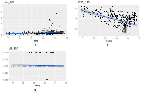 Temperature as independent variable: a scatterplot of positive linear correlation, T30 at 125 Hz (a), a scatterplot of negative linear correlation, C50 at 125 Hz (b), a scatterplot of non-linear correlation, LE at 250 Hz (c).