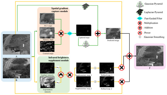 Motivated by the abovementioned discussion, we propose an feature-oriented dual-module complementary IVIF. Specifically, we analyzed five classical operators to replace the potential pitfalls of using scale decomposition filters to extract features according to the original image characteristics, and we comprehensively propose two feature extraction modules, namely, the spatial gradient capture module (SGCM) and infrared brightness supplement module (IBSM). As the name suggests, the former is more focused on preserving the spatial gradient information from the original images, which is constructed using principal component analysis (PCA), saliency, and contrast estimation operators. The latter compensates for the feature loss by focusing on improving two exposure metrics that are closely related to image intensity. Extensive experiments were performed on public datasets to prove that the proposed method has better fusion performance in terms of the overall contrast and feature preservation compared to other existing state-of-the-art fusion methods.