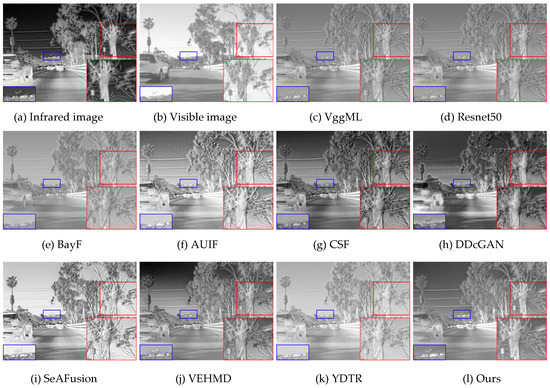 For further comparison, two groups of image pairs from the RoadScene dataset are examined to obtain the fused results, as shown in Figure 4 and Figure 5. In Figure 4, the overall contrast based on the VggML in Figure 4c, Resnet50 in Figure 4d, BayF in Figure 4e, and VEHMD in Figure 4j are dim, making it difficult to distinguish between infrared brightness information and texture details. The CSF and SeAFusion methods are extreme cases: one is too dim while the other is too bright, and both are fusion results that look unnatural; and the image information of the three lights in the distance is also lost, as shown in the blue enlarged boxes in Figure 4g,i. The DDcGAN in Figure 4h destroys the original texture structure of the source image, resulting in serious artifacts and noise. The AUIF and YDTR methods have improved considerably from the perspective of infrared brightness extraction; the detail information, however, is lost, e.g., the three lights in the blue magnified area in Figure 4f as well as the lightness and texture of the tree trunk in the red magnified area in Figure 4k. By contrast, our method has higher image quality owing to the well-preserved details of the infrared targets and visible features.