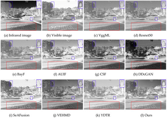 Similar conclusions are observable in Figure 5. The overall contrast of the VggML, Resnet50, and BayF methods are low, resulting in unrecognizable letters on the ground. Although the contrast of AUIF, SeAFusion, and YDTR have improved considerably, the over enhanced contrast makes the fused image look too bright, causing the texture on the wheel to be lost, as can be verified from the blue enlarged areas in Figure 5f,i,k. In addition, the methods based on CSF, DDcGAN, and VEHMD produce artifacts and noise, e.g., the outline of the tree within the blue magnified area. On the contrary, the fused image generated by the proposed algorithm in Figure 5l looks natural and preserves the finer details in the source images.